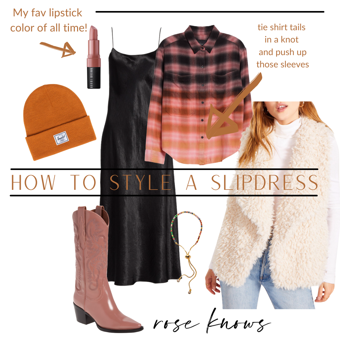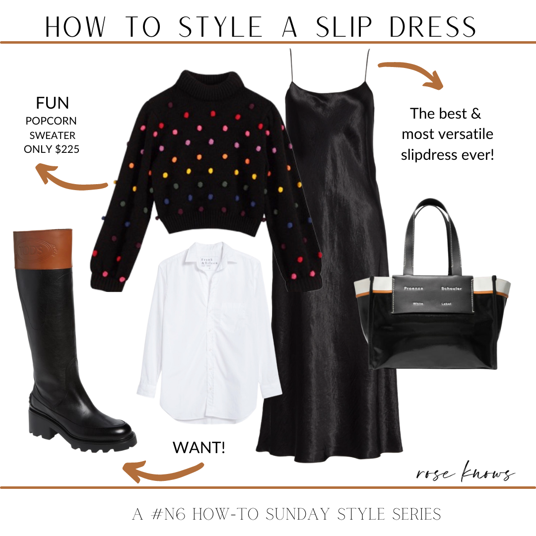 I’ve been wearing and talking about the ROSEKNOWS ‘magic slip dress‘ for a few years now! So when Nordstrom6 viewers asked for styling tips, I had a hard time narrowing it down to just ONE favorite way! In order to drive home why you need this must-have SLIPDRESS in your wardrobe, I’ve created 3 unique style board ideas below! Please note, WEARING THIS BLACK SILK SLIPDRESS TOTALLY ON ITS OWN WITH SOME FABUOUS JEWELRY IS OBVIOUSLY THE FIRST WAY TO STYLE IT! Now here are a few ‘outside the box’ ideas to try…