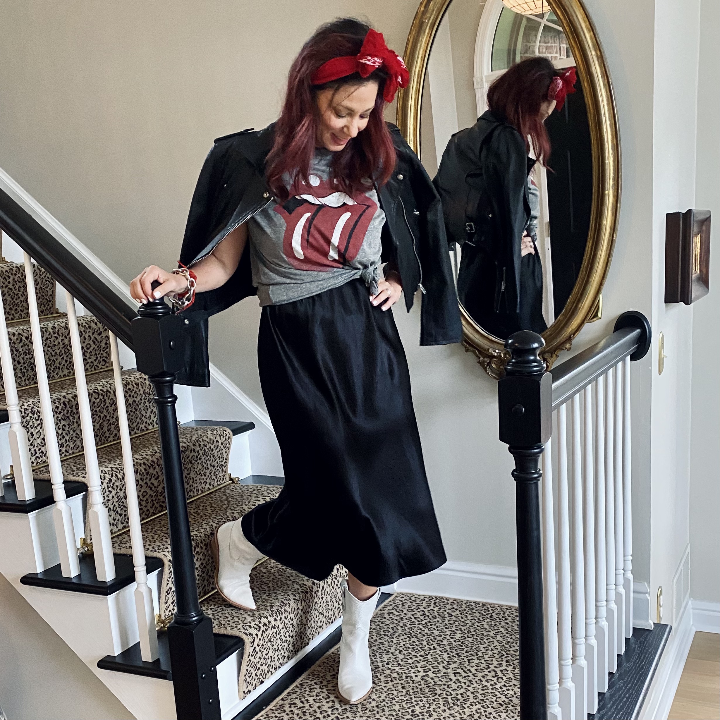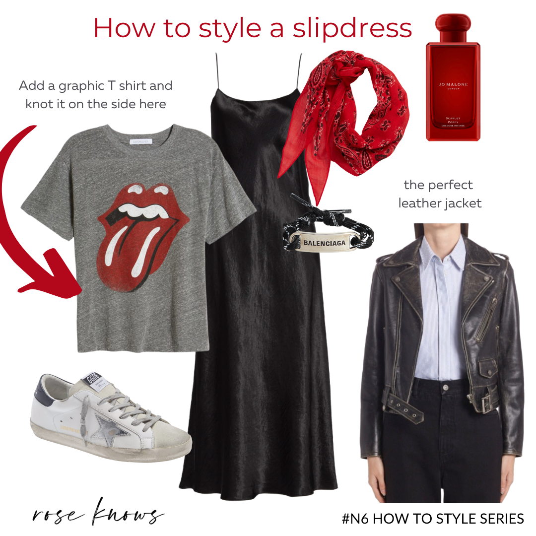 SLIPDRESS | GRAPHIC T-SHIRT | | GOLDEN GOOSE SNEAKERS | LEATHER JACKET | JO MALONE SCARLET POPPY | COOL RED BANDANA | BALENCIAGA BRACELET