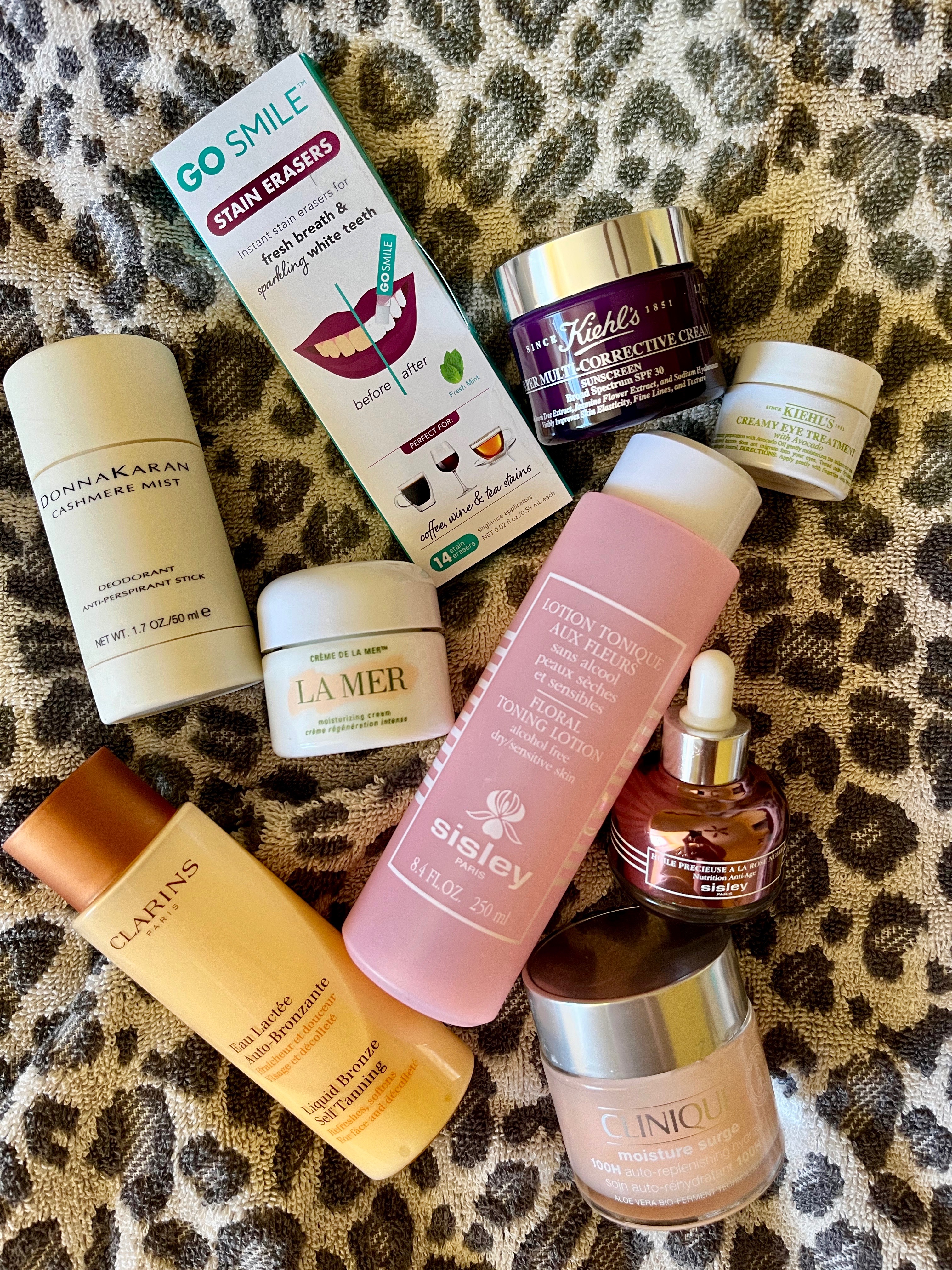 Under eye Creamy Avacado Under Eye Treatment by Keihl’s gets rave reviews and I just learned that its an excellent eye primer as well (I will be testing that soon)! Another Keihl’s product I use is the Super Multi-Corrective Anti-Aging Face & Neck Cream which has sunscreen and that’s a huge bonus for me. Also, just learned it is for the neck as well so bingo I’m going to apply on my neck as well from now on! I also use the whipped body butter (not shown) its super rich and smells so delicious. I have been super impressed with Kheil’s quality and price points. I’ve been using Clarin’s face tanner for at least 10 years. Its extremely light but gives me a subtle healthy glow that is probably only noticeable to me but I love it 🙂 I recently learned about Go Smile and am a huge fan. It gets 5 stars but what sold me is that it actually helps strengthen teeth enamel! If you want to step up your skin regimen, try Sisley products from France. I was introduced to a few of their luxury products and can say it’s worth the splurge! The two Sisley products I can’t live without are the Toning Lotion and the Rose Hip Anti Age Face Oil. Both smell divine !! For nightime, I like the rich emollient Le Mer Soft Creme and Kheils Midnight Recovery Concentrate Face Oil (not shown). I also love Clinique’s Moisture Surge for everyday. My girlfriend recently gave me the Jo Malone Vitamin E hand cream and told me to USE IT, lol! My hands look older than my face because I am terrible at remembering to use hand cream after each hand washing – this needs to be my New Years Resolution.