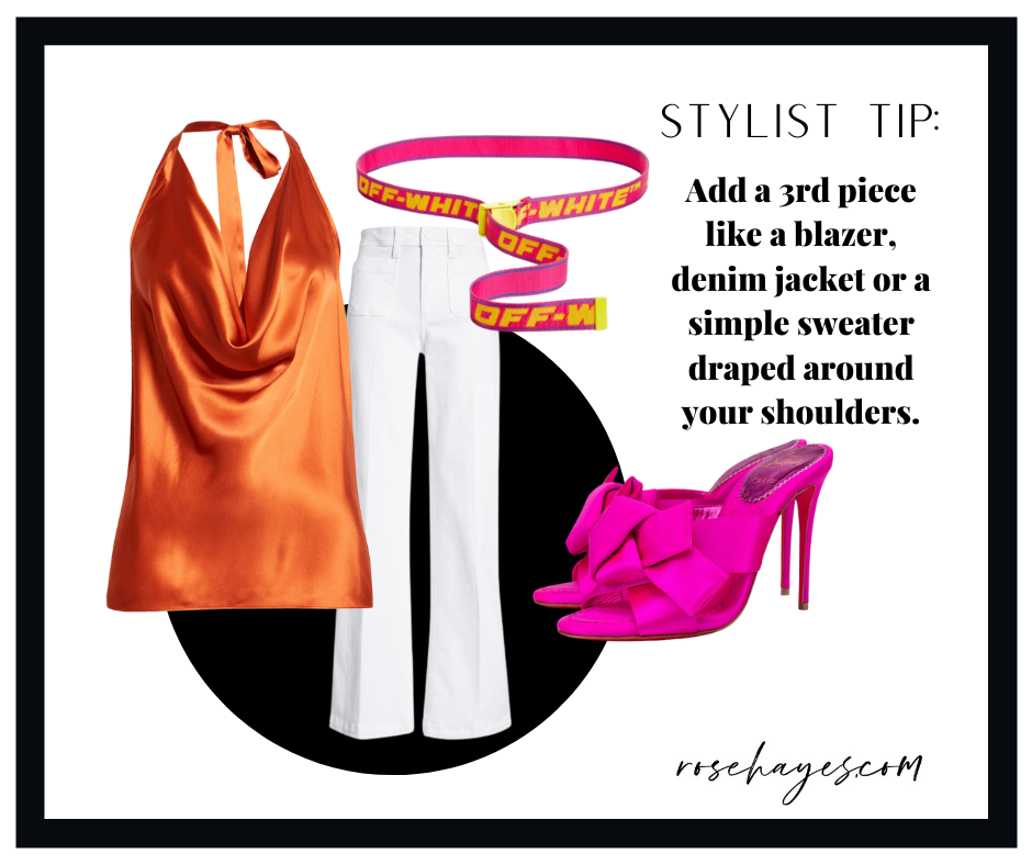 When doing blog research, I found the most gorgeous bright pink satin shoes here…and this silk orange halter top also caught my eye! These bright colors are sexy, fresh and happy! I think we all need a dose of vitamin C 🙂