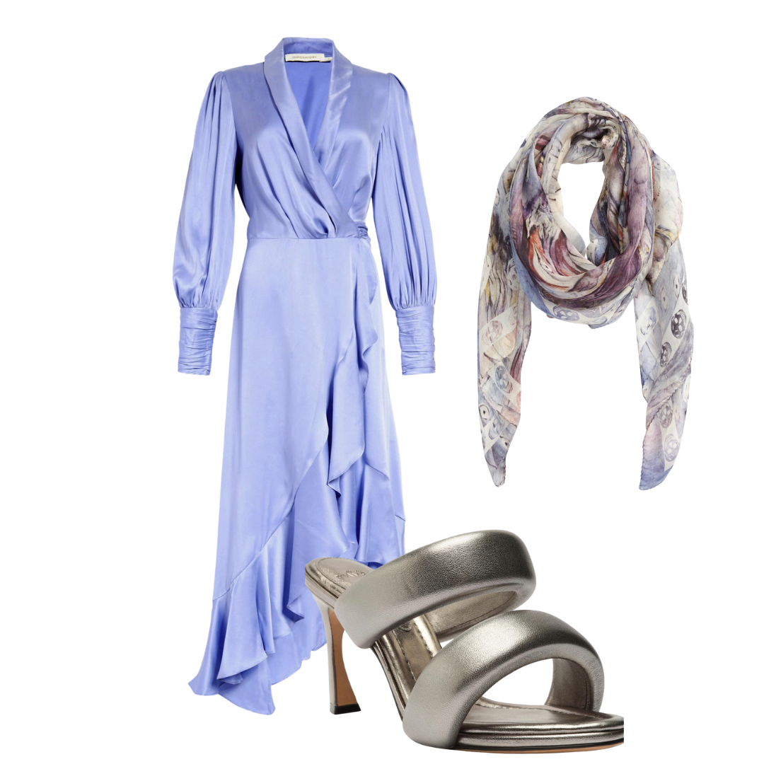 This pretty silk wrap dress and its mini sister here is a great seller because its perfect for so many occasions and looks great on everyone! Love this NEW Alexander McQueen scarf here priced at $345 and these pewter mules here (available in gold too).