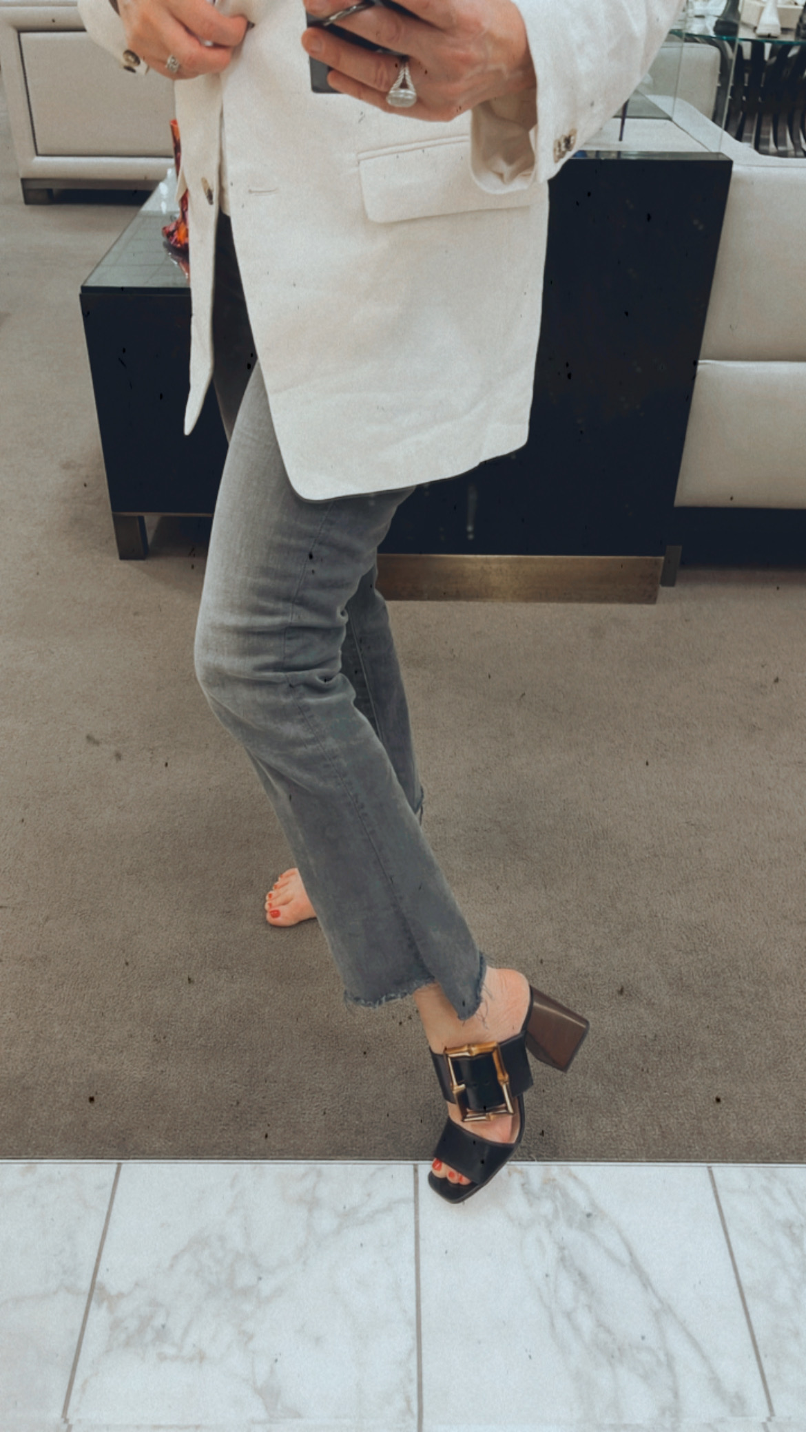 How cool is this mix – a conservative looking Veronica Beard jacket (above) with those inside out barrel cut Frame jeans?! Its all about the interesting juxtaposition that takes a so-so outfit to spectacular and fun! Add a white tank, strappy sandal, and accessory and look how cute you are 🙂