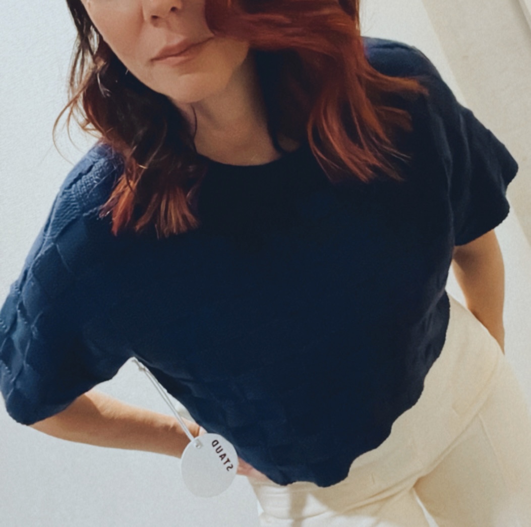 An Instagram follower asked me if the ‘basket weave’ patterned cotton sweater was Bottega Veneta … a great guess but its actually a much less pricey fresh brand called Staud ($225). It inspired me to build 2 unique style boards around this piece.