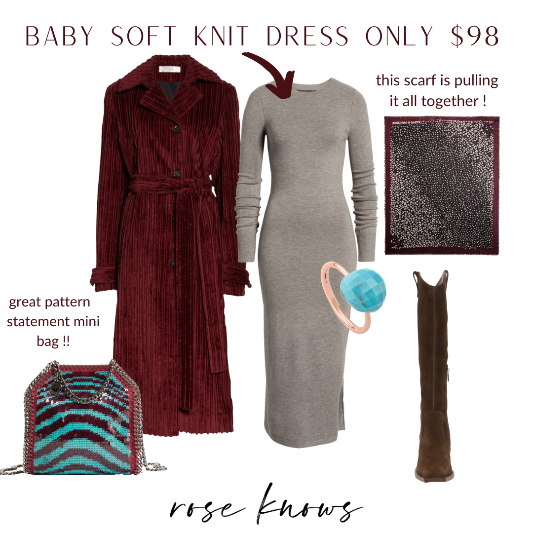corduroy trench coat | sweater dress (size up) | silk scarf | boots | turquoise ring | statement zebra sequin bag