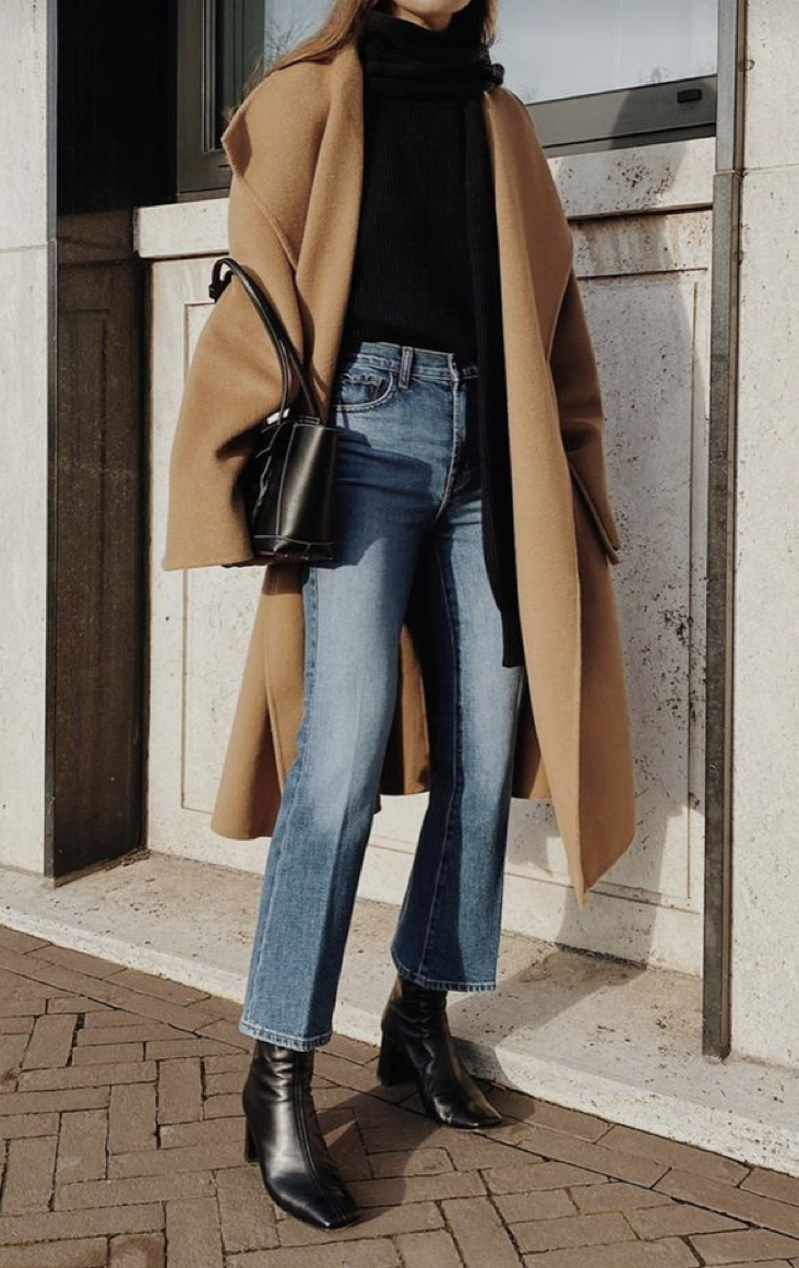 Similar Looks here: camel coat + black boots + turtleneck + black handbag + jeans