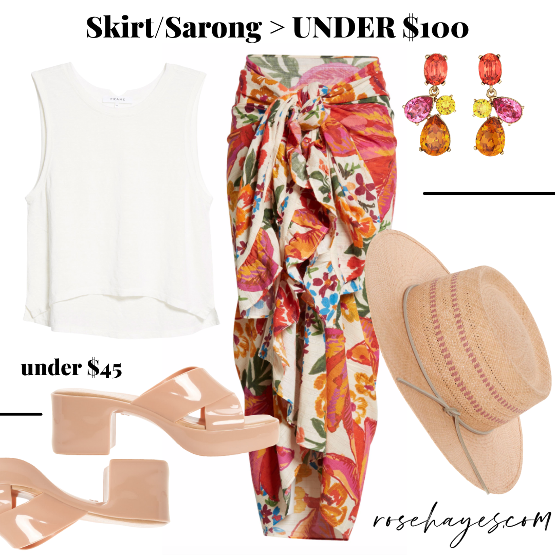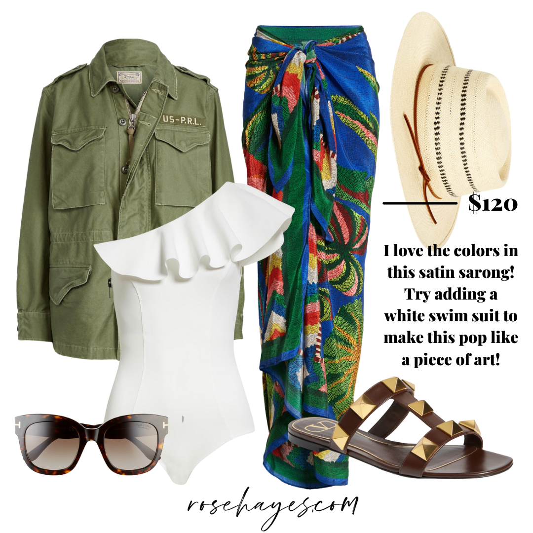 Recently many have requested swimsuits and cover ups. Personally I prefer a beach sarong to an actual garment made specifically for covering up. There are many ways to wear a scarf but while you’re at the beach, try these. Grab the ends of the scarf and just loosely tie it in the front or over to one side to cover your lower half. You can make a chic dress with an extra large scarf by criss crossing the two tails and slip the opening over your head, tie a knot behind your neck. Add a belt if you’d like. Watch this tutorial from my instagram reels last year HERE.