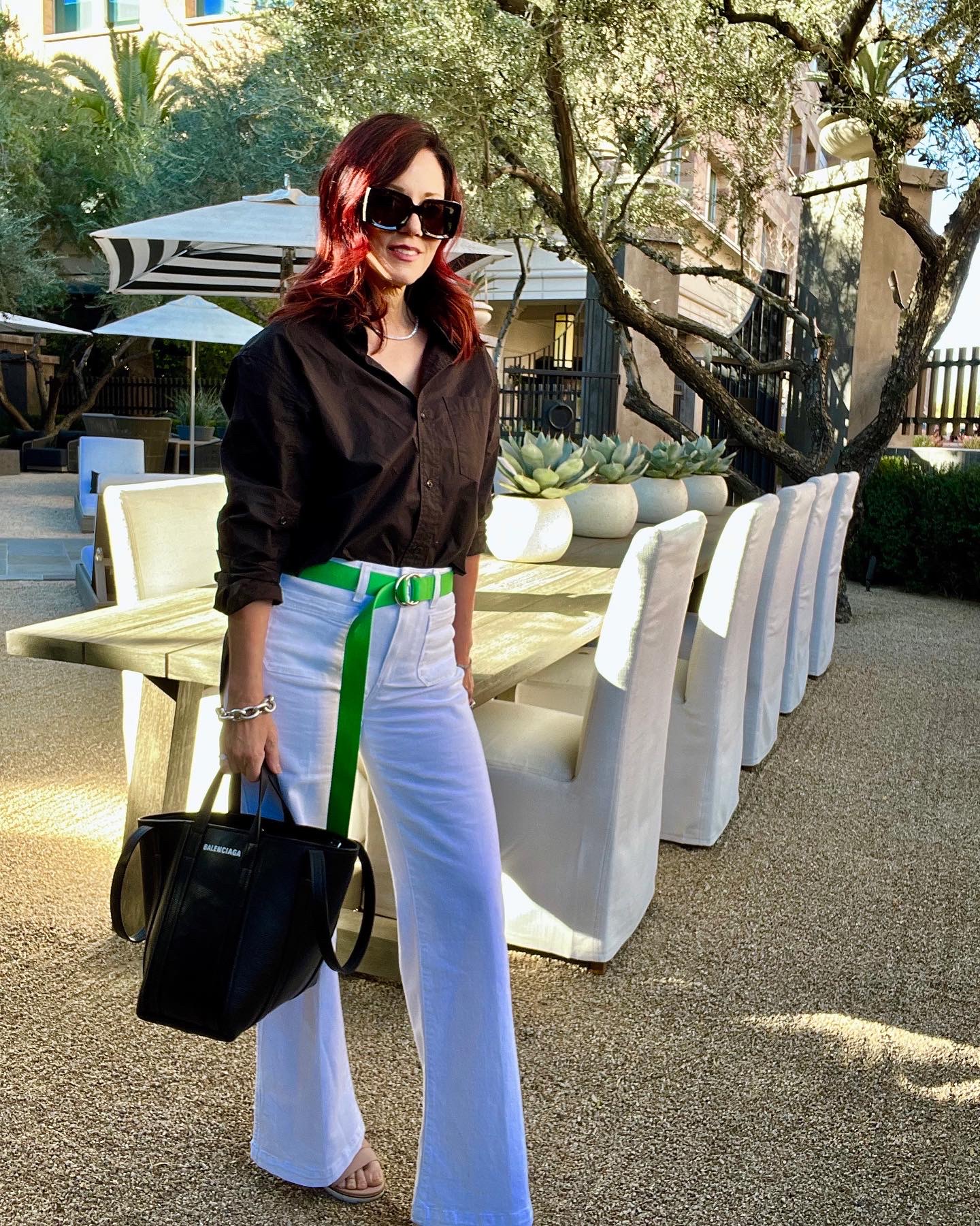 Next time you find yourself with nothing to wear, try a black & white combo! Hopefully you have a few great fitting black and white pants, dresses, tops and blazers. This color combo always works and couldn’t be easier. Add a pop of color in an accessory like my green Ganni belt – just for fun and whimsy. If green is too bright, try adding camel, charcoal or a red to break things up and add interest. I hope you’ll remember this easy color combo when you’re stuck and need to get ready fast!