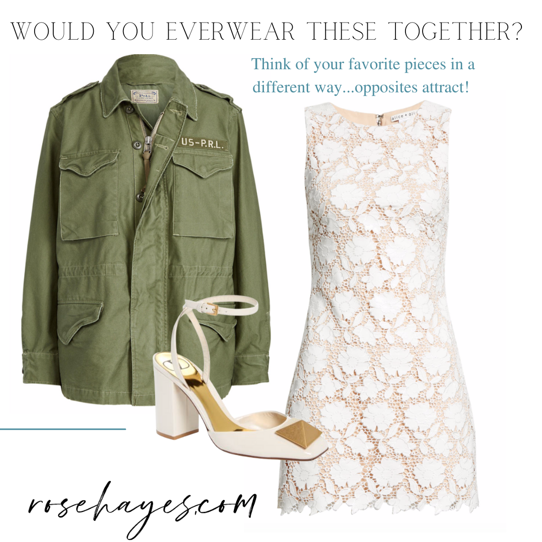 Have you ever noticed that sometimes the best outfits are unexpected or accidental? Like when you’re at a wedding with your significant other. It starts to get windy, he lends you his suit jacket and lo and behold that look is still one of your all time fav’s! This is because mixing opposites creates interesting juxtoposition and is uniquely yours (the look not the jacket haha). I love seeing how artists mix colors and mediums, just like this pretty feminine Alice and Olivia white lace mini dress which I paired with a cool girl casual army green Ralph Lauren jacket… get creative and break a few rules!