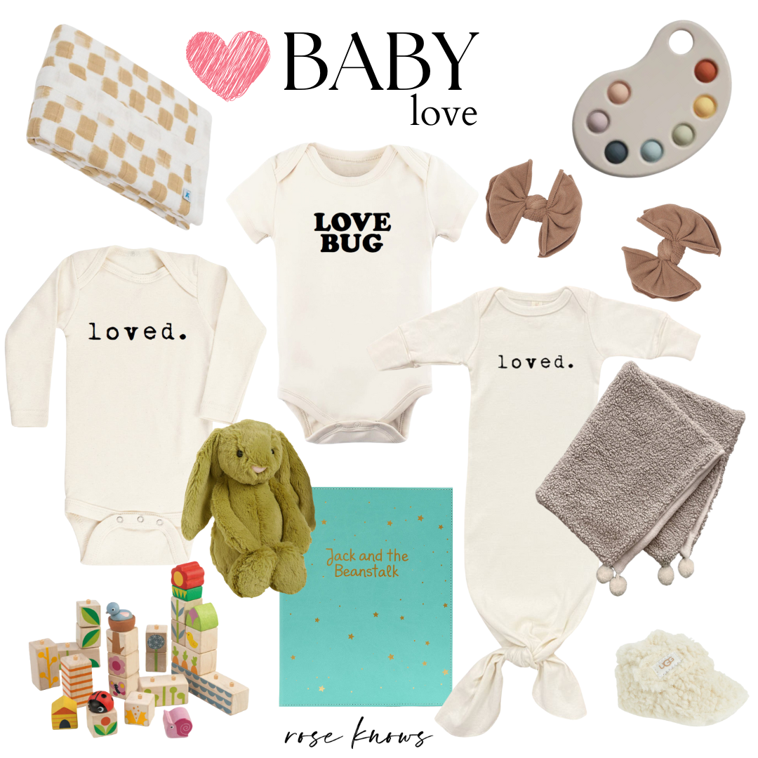 We’ve recently been blessed with newborn twins, Aly and Cash, and I couldn’t be more obsessed with them 🙂 They inspired the style board above. I love the organic natural cotton fabric on these simple onesies. Both of my daughters are anti-plastic toys, so I choose wooden blocks, natural fabrics, and classic books. Shop Baby Love here.